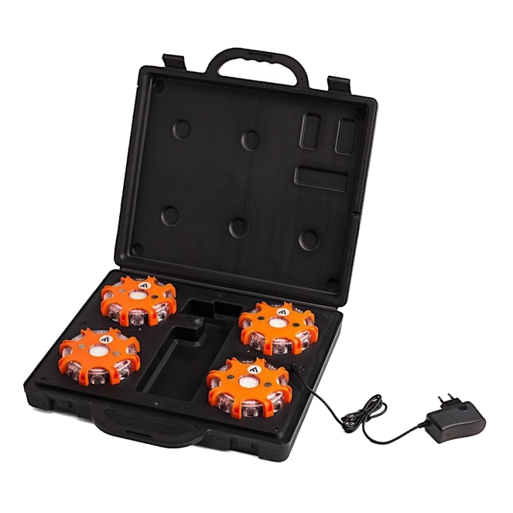 Obsah sady: 4x signalizačný disk, sada nabíjačiek 230V a 12V, nabíjacie puzdro.