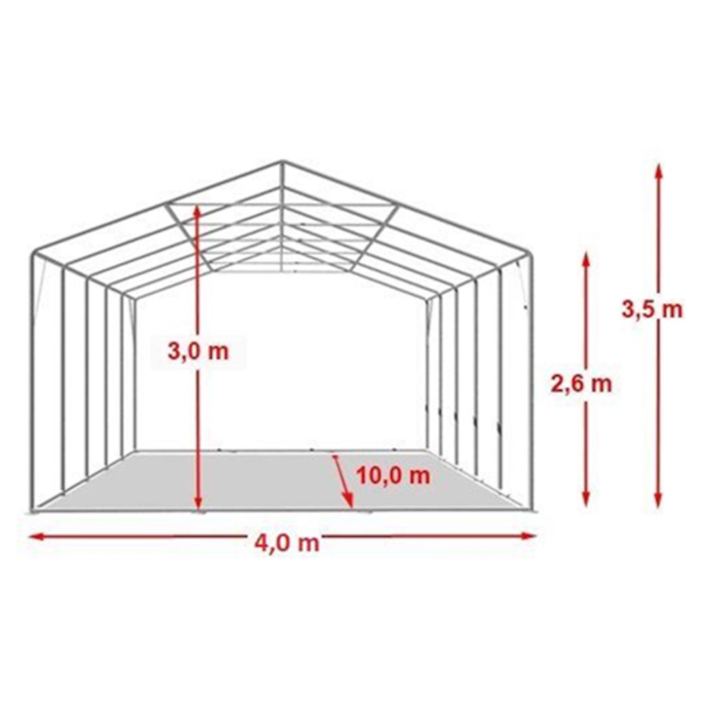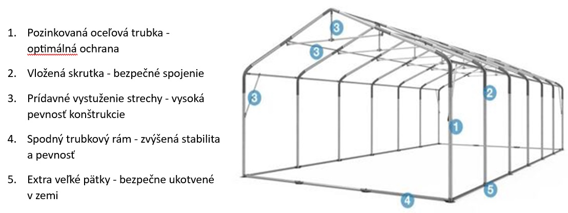 Oceľový rám stanu z pozinkovaných rúr s priemerom cca 50 mm a hrúbkou steny 1,6 mm (horizontálne trubky priemer 38mm, hrúbka steny 1,2 mm).