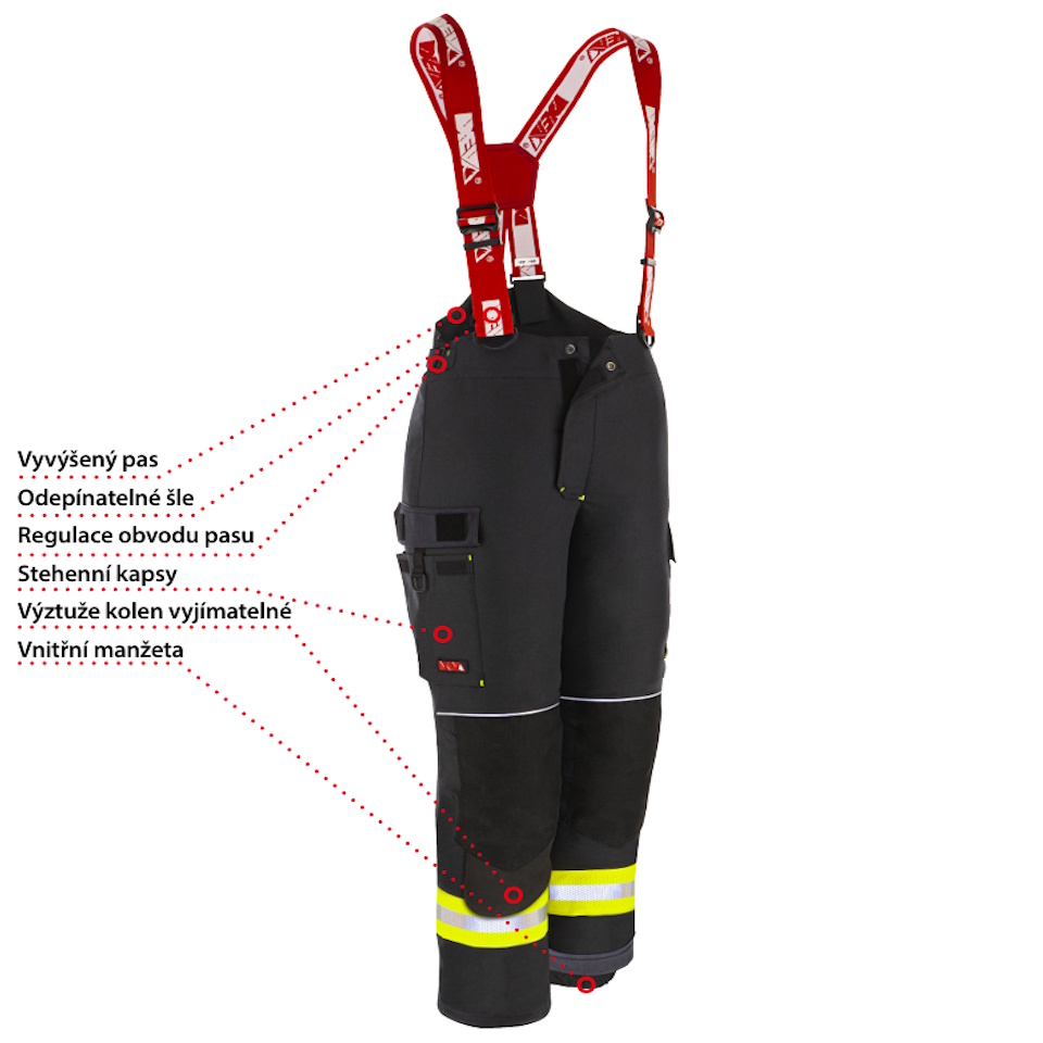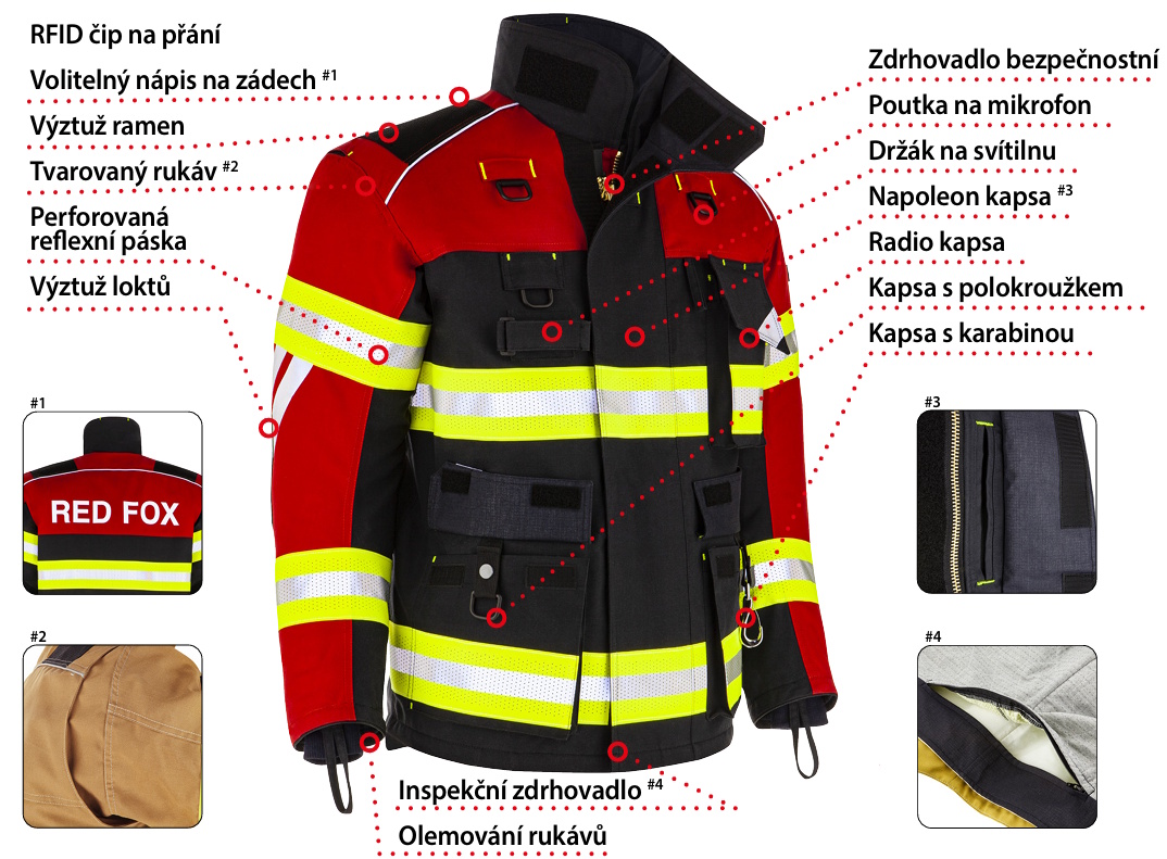 Viacvrstvový zásahový oblek RED FOX. Odev spĺňa THERMO-TEX TEST (testované podľa EN 469: 2005 - príloha C) - popáleniny 2. / 3. stupňa.