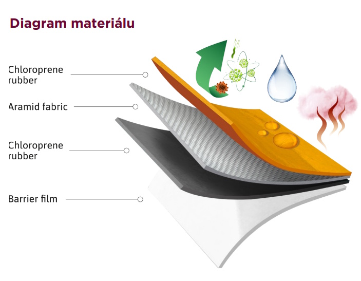 Materiál: vonkajší: chloroprenová guma potiahnutá na Nomex® látke, vnútorný: chloroprénová guma s viacvrstvovou laminátovou bariérou, vysoko účinný AlphaTec HCR zips.