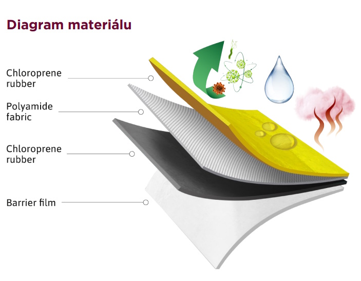 Materiál: vonkajší: chloroprenová guma potiahnutá na polyamidovej látke, vnútorný: chloroprénová guma s viacvrstvovou laminátovou bariérou, vysoko účinný AlphaTec HCR zips.
